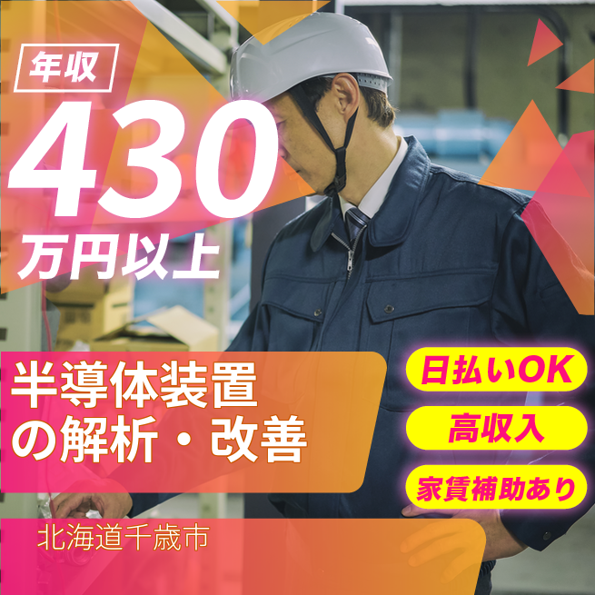 給与詳細 年収例 4,380,000円 月収例 365,000円 勤務地 北海道千歳市 仕事内容 半導体製造装置のオペレーションや解析業務、改善業務となります。