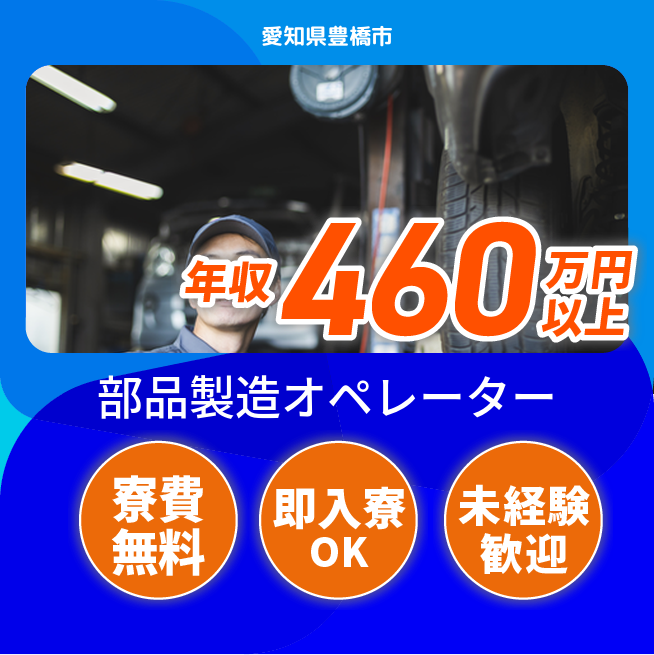 ATR3 寮・社宅 寮あり(無料) 求人番号 114999-2 給与詳細 年収例 4,680,000円 月収例 390,000円 時給例:1662円