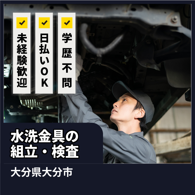 給与詳細 月収例 240,000円 日給例 10,000円 勤務地 大分県大分市 仕事内容 水洗金具の組立、組付け、検査