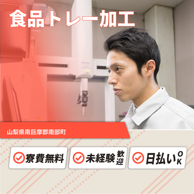 給与詳細 月収例 245,000円 日給例 11,200円 勤務地 山梨県南巨摩郡南部町 仕事内容 【業務内容】