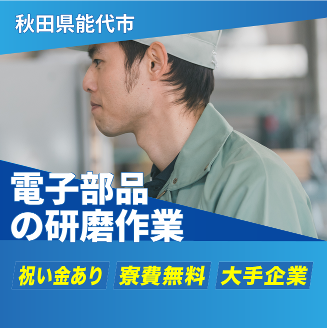 給与詳細 月収例 273,000円 日給例 12,000円 勤務地 秋田県能代市 仕事内容 小型電子部品の研磨業務