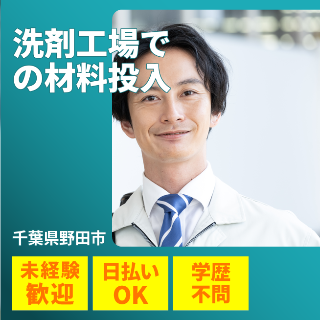 給与詳細 月収例 276,000円 日給例 11,600円 勤務地 千葉県野田市 仕事内容 ・業務用洗剤を製造している工場での原材料投入や計量業務!