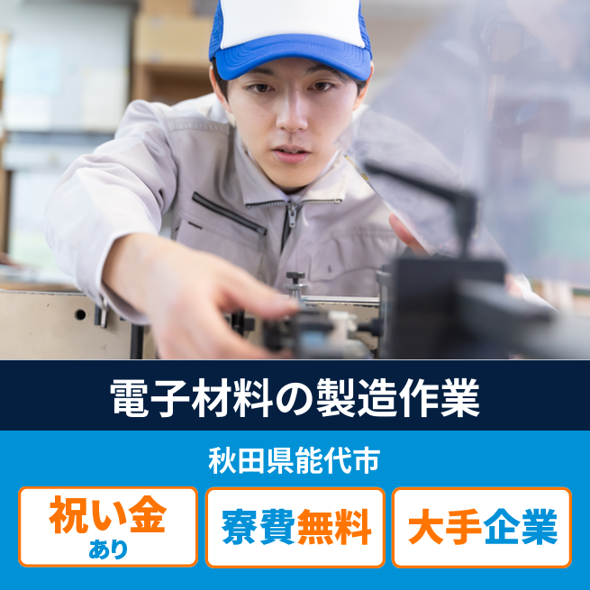 給与詳細 月収例 273,000円 日給例 12,000円 勤務地 秋田県能代市 仕事内容 光ファイバーに使用する電子材料の製造作業