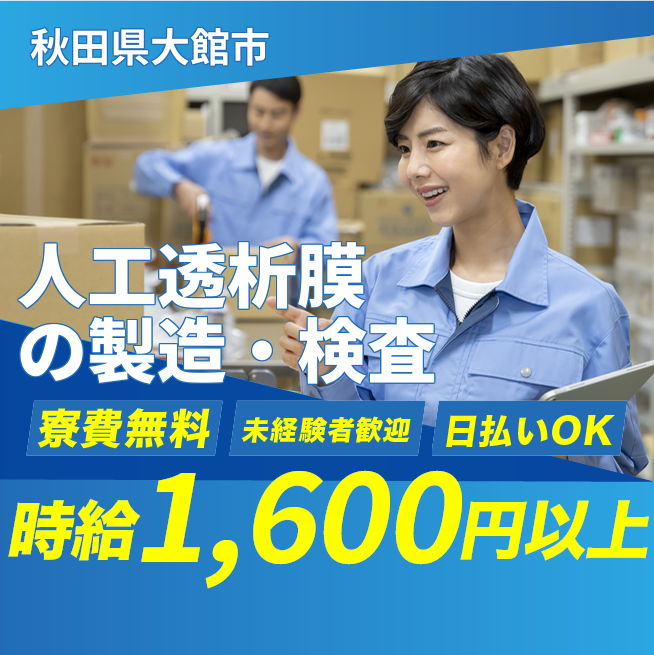 給与詳細 月収例 268,000円 時給例 1,600円 勤務地 秋田県大館市 仕事内容 クリーンルーム内で、人工透析膜に使用される“中空糸”の製造・検査を行っていただきます。