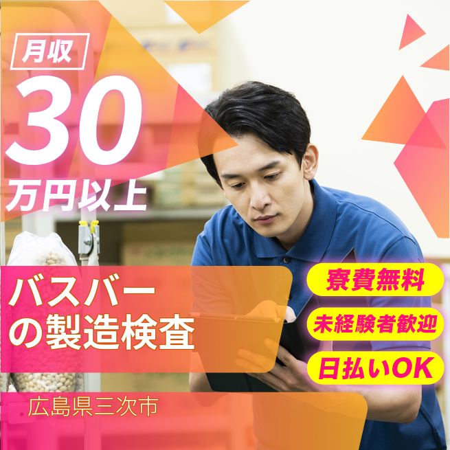 給与詳細 月収例 300,000円 日給例 11,040円 勤務地 広島県三次市 仕事内容 車で使われる電流を流す製品(バスバー)製造/検査運搬