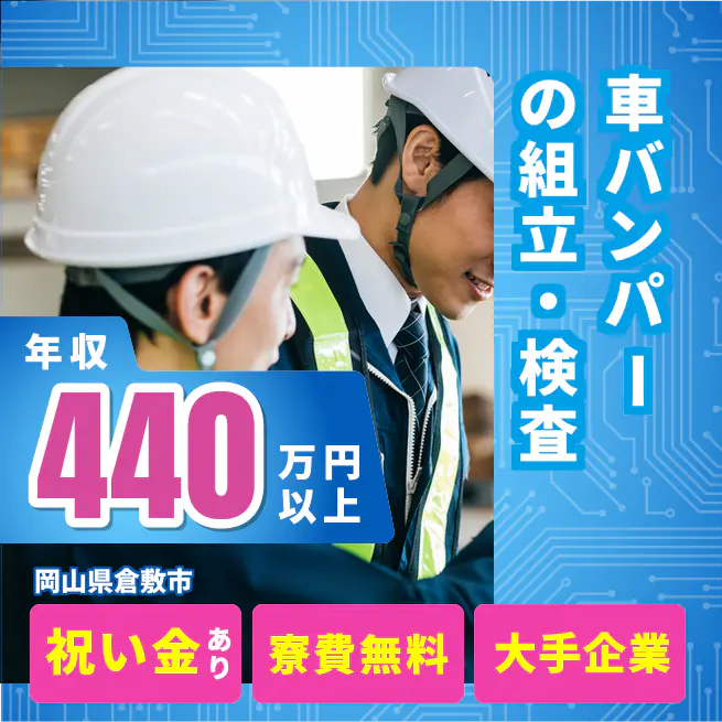 給与詳細 年収例 4,452,000円 月収例 371,000円 勤務地 岡山県倉敷市 仕事内容 主な生産工程は組立ライン、成形ライン、塗装ラインになります。