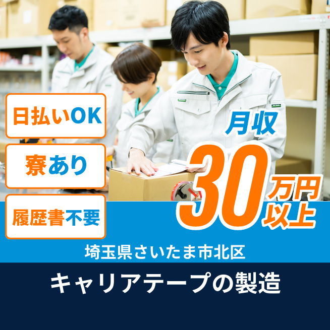 給与詳細 月収例 320,000円 日給例 10,400円 勤務地 埼玉県さいたま市北区 仕事内容 キャリアテープ(プラスチック製のテープ/産業用製品)の製造業務