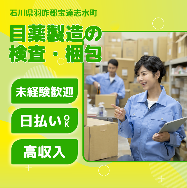 給与詳細 月収例 291,000円 日給例 12,000円 勤務地 石川県羽咋郡宝達志水町 仕事内容 医療用・市販用の目薬の製造・検査・梱包