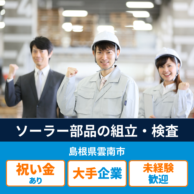 給与詳細 月収例 202,000円 時給例 1,150円 勤務地 島根県雲南市 仕事内容 ソーラーパネル関連部品の組立・検査・梱包