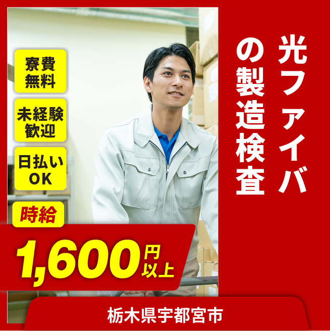 給与詳細 月収例 299,000円 時給例 1,600円 勤務地 栃木県宇都宮市 仕事内容 光ファイバ及びファイバ用ガラス材の製造・検査・出荷業務
