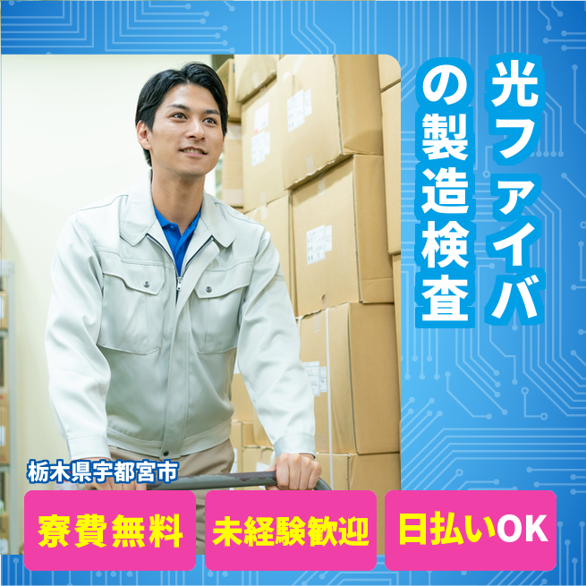 給与詳細 月収例 286,000円 日給例 12,000円 勤務地 栃木県宇都宮市 仕事内容 光ファイバ及びファイバ用ガラス材の製造・検査・出荷業務