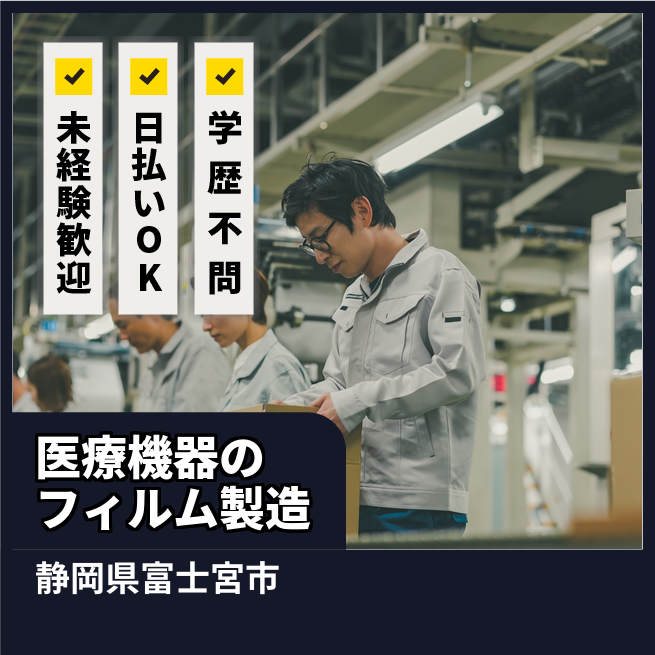 給与詳細 月収例 257,000円 日給例 10,800円 勤務地 静岡県富士宮市 仕事内容 医療機器などに資料されるフィルムの製造