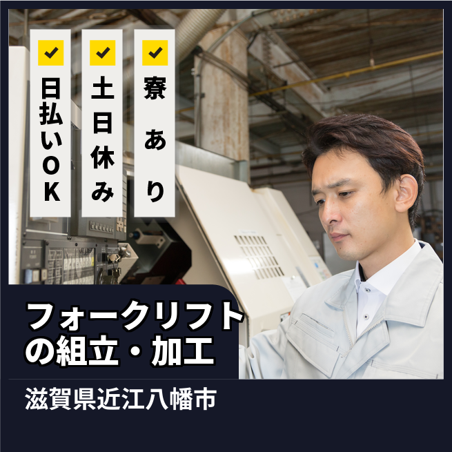 給与詳細 月収例 231,000円 日給例 10,020円 勤務地 滋賀県近江八幡市 仕事内容 フォークリフトの組立・加工・出荷準備・塗装・溶接