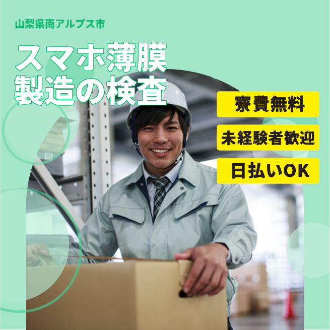 給与詳細 月収例 280,000円 日給例 10,400円 勤務地 山梨県南アルプス市 仕事内容 スマホ向けの薄膜製品・積層製品製造