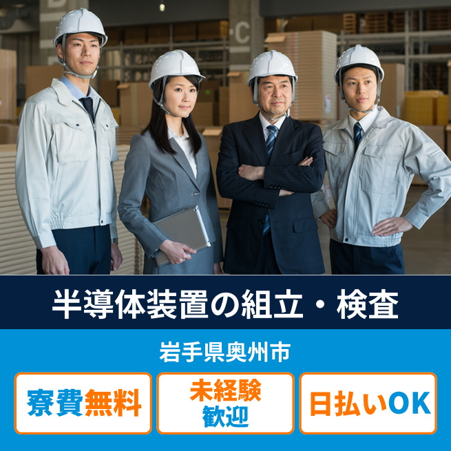 給与詳細 月収例 281,000円 日給例 11,200円 勤務地 宮城県黒川郡大衡村 仕事内容 ・半導体装置の組立・検査業務