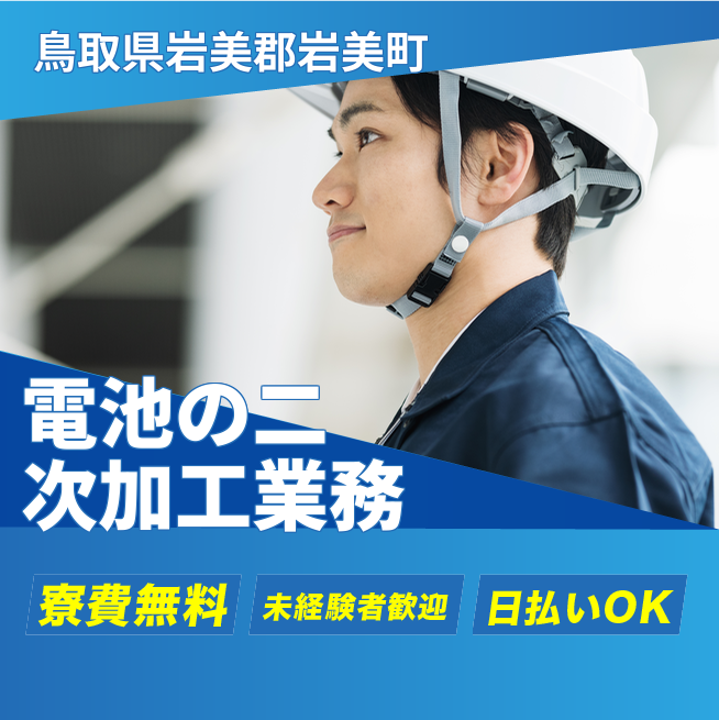 給与詳細 月収例 250,000円 日給例 11,600円 勤務地 鳥取県岩美郡岩美町 仕事内容 電池の二次加工業務及び付帯作業