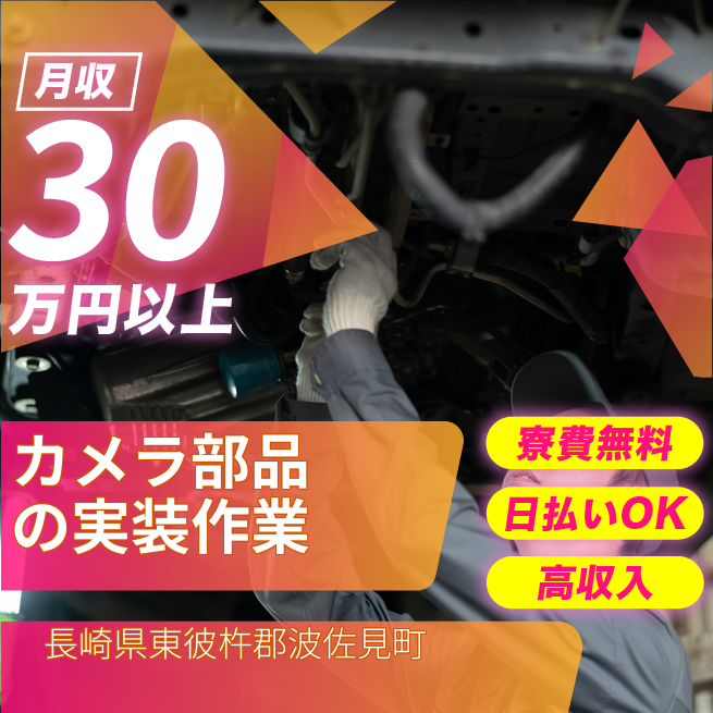 給与詳細 月収例 300,000円 日給例 12,000円 勤務地 長崎県東彼杵郡波佐見町 仕事内容 大手企業・カメラ類の製造に係るお仕事「実装技術」の仕事です。