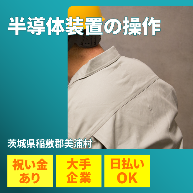 給与詳細 月収例 239,000円 日給例 10,400円 勤務地 茨城県稲敷郡美浦村 仕事内容 半導体装置のマシンオペレーション(請負)