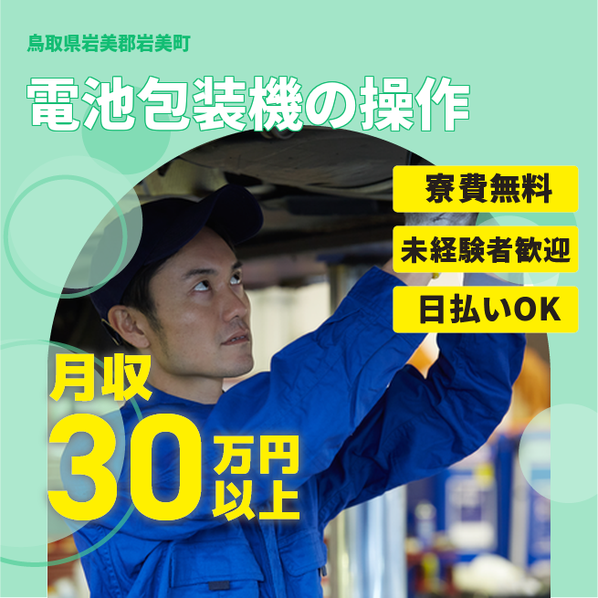 給与詳細 月収例 325,000円 日給例 11,600円 勤務地 鳥取県岩美郡岩美町 仕事内容 円筒電池フィルム包装機械オペレーターの業務です。
