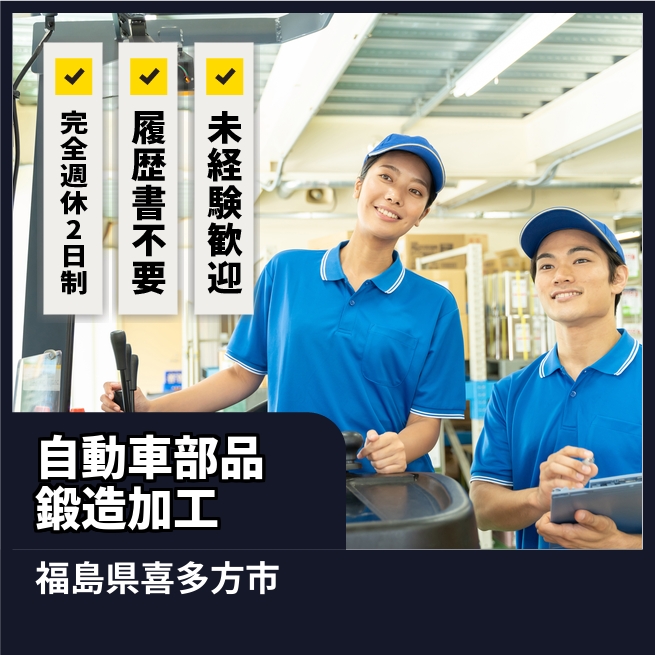 給与詳細 月収例 234,000円 時給例 1,200円 勤務地 福島県喜多方市 仕事内容 自動車部品の鍛造加工及び付随する業務