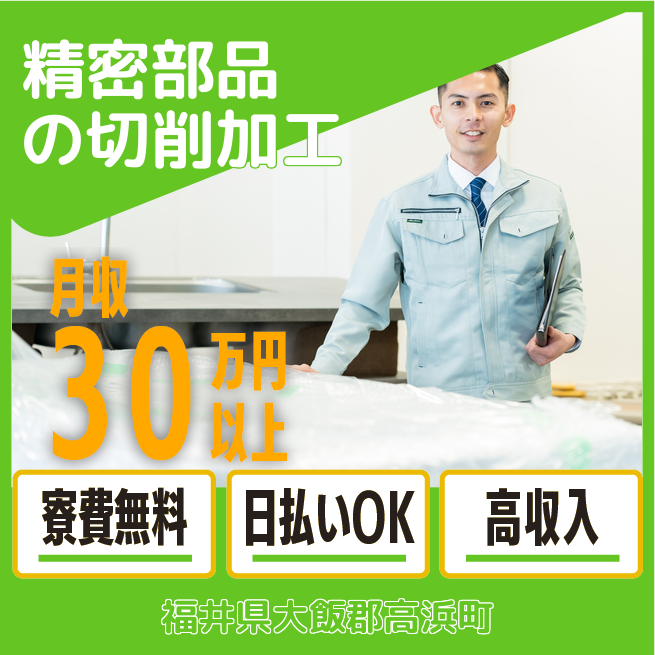 給与詳細 月収例 330,000円 時給例 1,640円 勤務地 福井県大飯郡高浜町 仕事内容 【精密部品の切削加工】