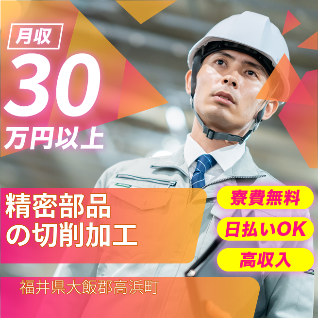 給与詳細 月収例 330,000円 時給例 1,640円 勤務地 福井県大飯郡高浜町 仕事内容 【業務内容】精密部品の切削加工を行う作業