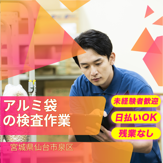 給与詳細 月収例 190,000円 時給例 1,180円 勤務地 宮城県仙台市泉区 仕事内容 【アルミ袋の検査】