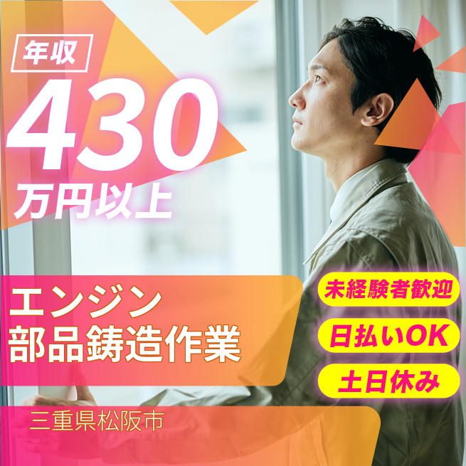 給与詳細 年収例 4,320,000円 月収例 360,000円 勤務地 三重県松阪市 仕事内容 【エンジン部品の鋳造】