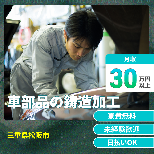 給与詳細 月収例 310,000円 日給例 10,800円 勤務地 三重県松阪市 仕事内容 【車部品の鋳造加工】