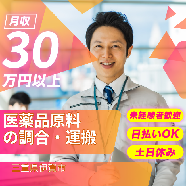 給与詳細 月収例 300,000円 日給例 12,000円 勤務地 三重県伊賀市 仕事内容 【業務内容】医薬品原料の調合と運搬業務