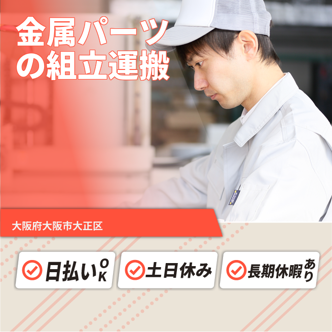◆日払い・仮払いOK(アプリでカンタン申請!) 交通費 支給あり 応募の流れ 本ページ内<応募する>ボタンより、必要項目をご入力の上、ご応募ください。 勤務地 【勤務地】大阪府大阪市大正区南恩加島 勤務時間 【勤務地】8:30~17:15(休憩45分+小休憩15分)