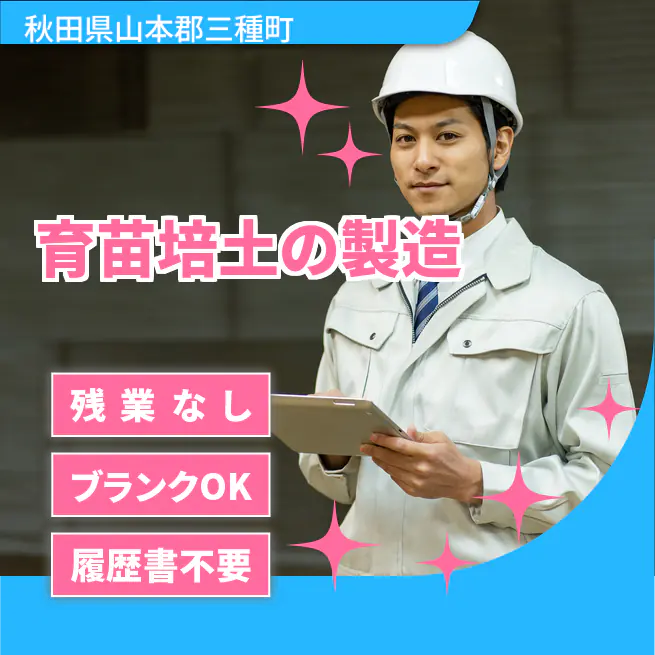 時給例:1150円 応募の流れ 本ページ内<応募する>ボタンより、必要項目をご入力の上、ご応募ください。 勤務地 【勤務地】秋田県山本郡三種町- 勤務時間 【勤務地】①8:00~16:30