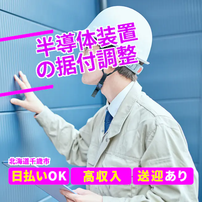 給与詳細 月収例 291,000円 日給例 12,000円 勤務地 北海道千歳市 仕事内容 半導体製造装置の据付/調整/保守保全業務