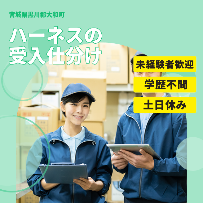 給与詳細 月収例 210,225円 時給例 1,218円 勤務地 宮城県黒川郡大和町 仕事内容 折り畳みコンテナに積載されたハーネスの受入及び仕分け作業を行っていただきます。