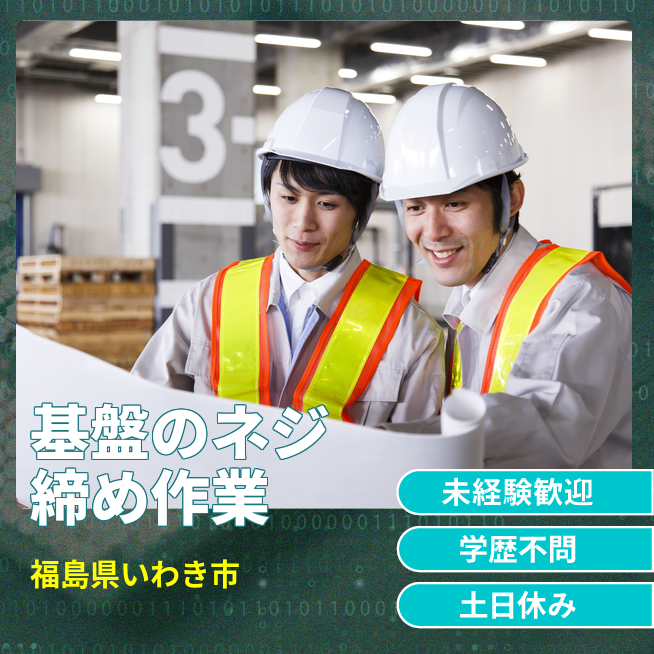 時給例:1104円 交通費 支給なし 応募の流れ 本ページ内<応募する>ボタンより、必要項目をご入力の上、ご応募ください。 勤務地 【勤務地】福島県いわき市好間工業団地 勤務時間 【勤務地】【日勤】