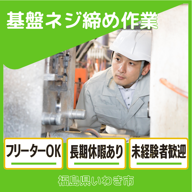 時給例:1104円 交通費 支給なし 応募の流れ 本ページ内<応募する>ボタンより、必要項目をご入力の上、ご応募ください。 勤務地 【勤務地】福島県いわき市好間工業団地 勤務時間 【勤務地】【日勤】