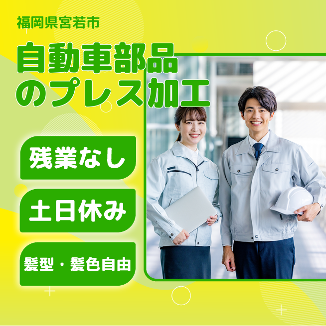 給与詳細 月収例 193,000円 時給例 1,206円 勤務地 福岡県宮若市 仕事内容 様々な自動車部品を主にプレス機を用いた加工をしている工場です。