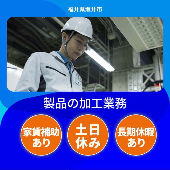 給与詳細 月収例 227,789円 日給例 10,000円 勤務地 福井県坂井市 仕事内容 【加工業務】