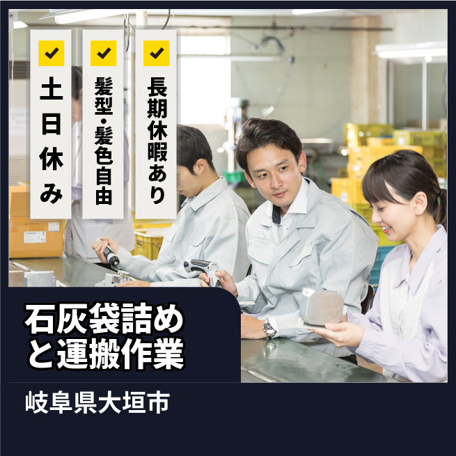 給与詳細 月収例 243,675円 日給例 10,800円 勤務地 岐阜県大垣市 仕事内容 石灰の粉の袋詰め作業