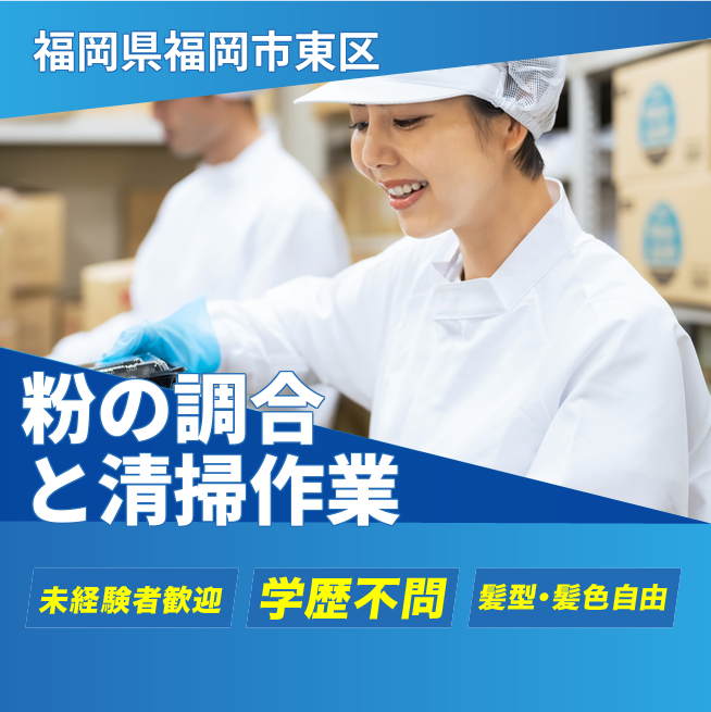 給与詳細 月収例 211,973円 時給例 1,100円 勤務地 福岡県福岡市東区 仕事内容 指示書通りに粉の調合作業。