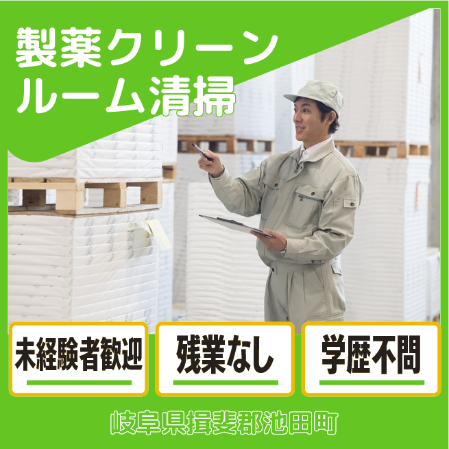 給与詳細 月収例 200,000円 日給例 10,000円 勤務地 岐阜県揖斐郡池田町 仕事内容 医薬品製造会社の製造エリア(クリーンルーム)内の清掃作業