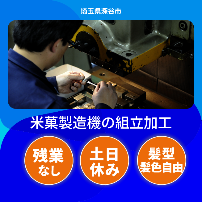 給与詳細 月収例 220,000円 日給例 11,000円 勤務地 埼玉県深谷市 仕事内容 おせんべい等の米菓を製造するための機械製造になります。