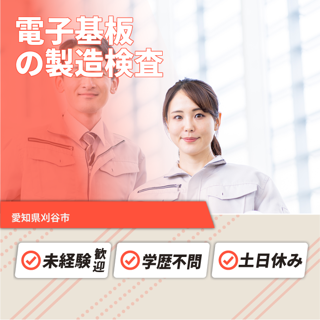 給与詳細 月収例 222,625円 日給例 10,400円 勤務地 愛知県刈谷市 仕事内容 自動車用の電子基板(緑色の板のような物に細かい部品がついている製品)を製造検査している企業でございます。