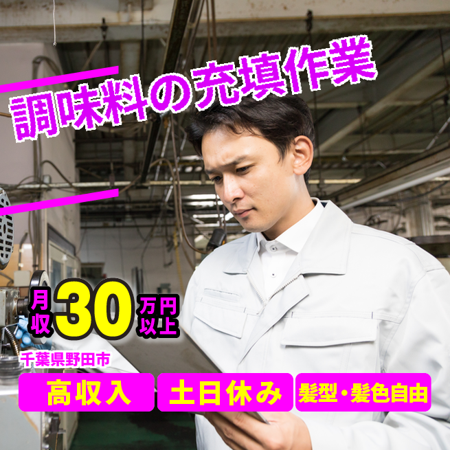給与詳細 月収例 311,440円 時給例 1,600円 勤務地 千葉県野田市 仕事内容 大手食品メーカーで、調味料の充填作業などをお願いします。