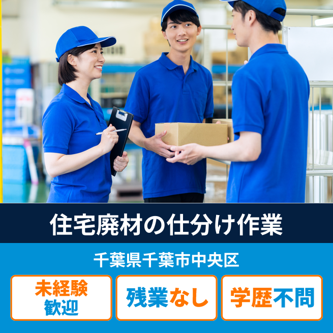 給与詳細 月収例 243,600円 日給例 11,600円 勤務地 千葉県千葉市中央区 仕事内容 住宅の解体後に出た廃材の仕分け作業をお願いします。