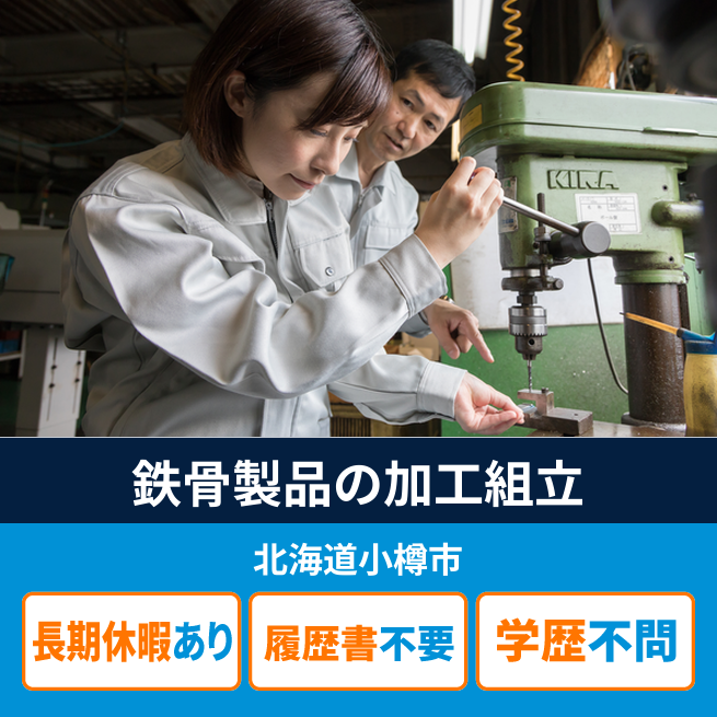 給与詳細 月収例 240,275円 日給例 10,500円 勤務地 北海道小樽市 仕事内容 ●鍛冶・溶接業務