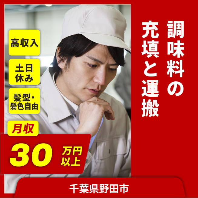 給与詳細 月収例 309,718円 時給例 1,625円 勤務地 千葉県野田市 仕事内容 大手食品メーカーで、調味料の充填作業などをお願いします。