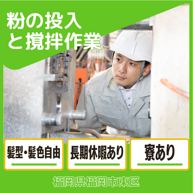 ミキサーへの粉投入と撹拌作業、及び月末の工場清掃を担当します。