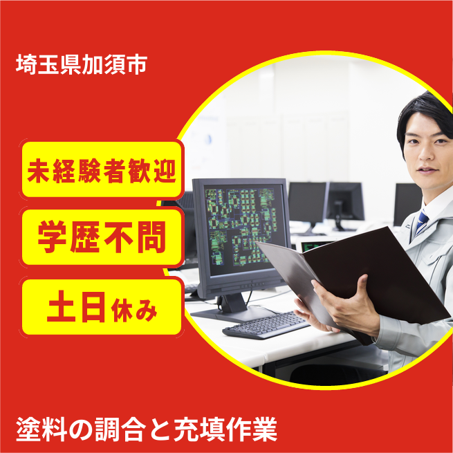 就業場所:無/就業範囲:無 建築用や自動車用塗料を製造している工場で、調合や充填作業などをお願いします。