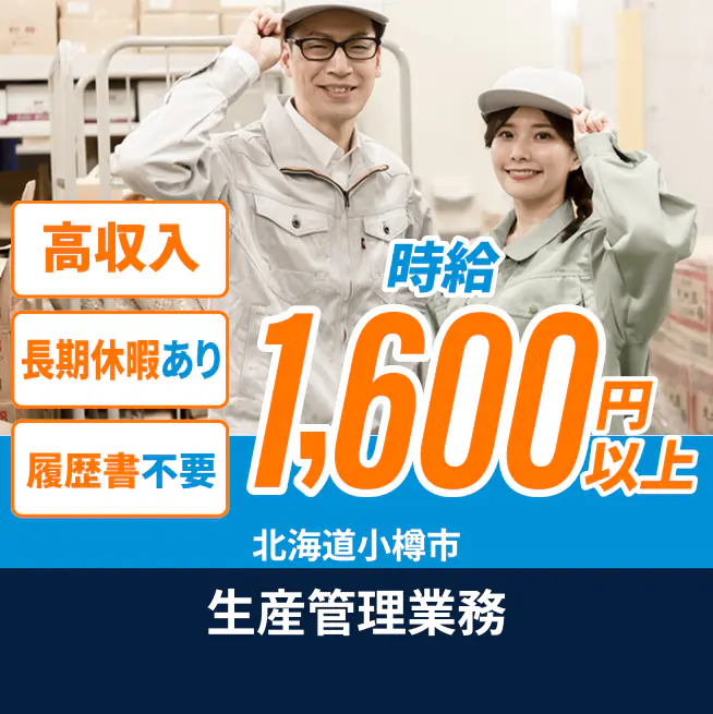 時給例:1625円 交通費 支給なし 応募の流れ 本ページ内<応募する>ボタンより、必要項目をご入力の上、ご応募ください。 勤務地 【勤務地】北海道小樽市銭函3丁目 勤務時間 【勤務地】【日勤】